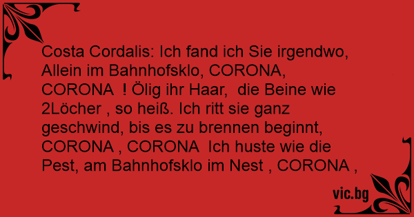 Costa Cordalis: Ich fand ich Sie irgendwo, Allein im Bahnhofsklo, CORONA, CORONA ! Ölig ihr Haar, die Beine wie 2Löcher , so heiß. Ich ritt sie ganz geschwind, bis es zu brennen beginnt, CORONA , CORONA Ich huste wie die Реsт, am Bahnhofsklo im Nest , CORONA , CORONA