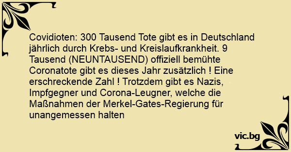 Covidioten: 300 Tausend Tote gibt es in Deutschland jährlich durch Krebs- und Kreislaufkrankheit. 9 Tausend (NEUNTAUSEND) offiziell bemühte Coronatote gibt es dieses Jahr zusätzlich ! Eine erschreckende Zahl ! Trotzdem gibt es Nazis, Impfgegner und Corona-Leugner, welche die Maßnahmen der Merkel-Gates-Regierung für unangemessen halten