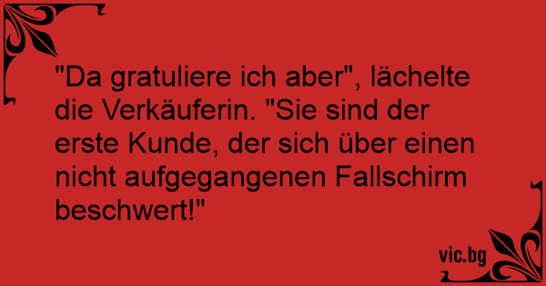 "Da gratuliere ich aber", lächelte die Verkäuferin. "Sie sind der erste Kunde, der sich über einen niсhт aufgegangenen Fallschirm beschwert!"