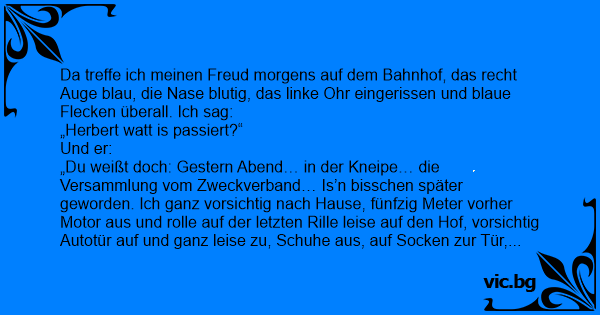 Da treffe ich meinen Freud morgens auf dem Bahnhof, das recht Auge blau, die Nase blutig, das linke Ohr eingerissen und blaue Flecken überall. Ich sag: