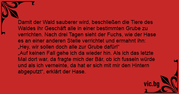 Damit der Wald sauberer wird, beschließen die Tiere des Waldes ihr Geschäft alle in einer bestimmten Grube zu verrichten. Nach drei Tagen sieht der Fuchs, wie der Hase es an einer anderen Stelle verrichtet und ermahnt ihn: