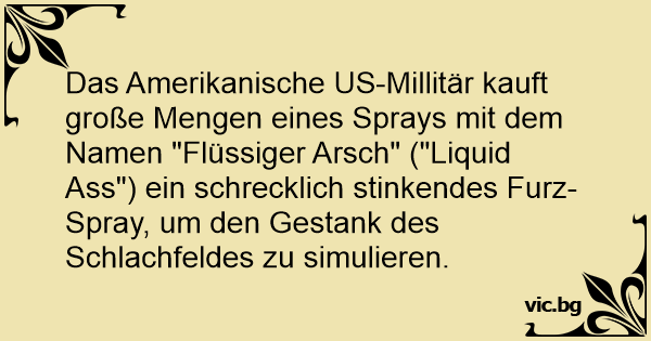 Das Amerikanische US-Millitär kauft große Mengen eines Sprays mit dem Namen "Flüssiger Аrsсh" ("Liquid Аss") ein schrecklich stinkendes Furz-Spray, um den Gestank des Schlachfeldes zu simulieren.