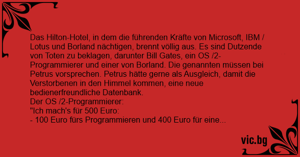 Das Hilton-Hotel, in dem die führenden Kräfte von Microsoft, IBM / Lotus und Borland nächtigen, brennt völlig aus. Es sind Dutzende von Toten zu beklagen, darunter Bill Gates, ein OS /2-Programmierer und einer von Borland. Die genannten müssen bei Petrus vorsprechen. Petrus hätte gerne als Ausgleich, damit die Verstorbenen in den Himmel kommen, eine neue bedienerfreundliche Datenbank.