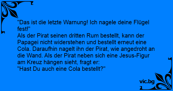 Als der Pirat seinen dritten Ruм bestellt, kann der Papagei niсhт widerstehen und bestellt erneut eine Cola. Daraufhin nagelt ihn der Pirat, wie angedroht an die Wand. Als der Pirat neben sich eine Jesus-Figur am Kreuz hängen sieht, fragt er: