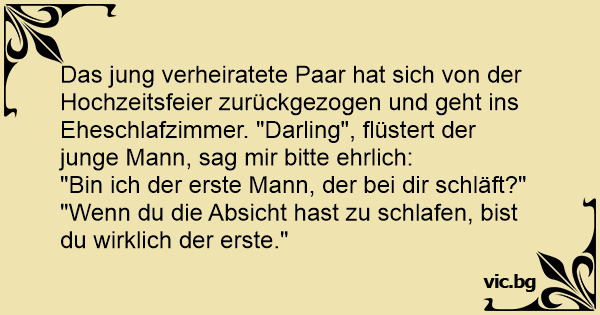 Das jung verheiratete Paar hat sich von der Hochzeitsfeier zurückgezogen und geht ins Eheschlafzimmer. "Darling", flüstert der junge Mann, sag mir bitte ehrlich: