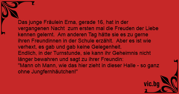 Das junge Fräulein Erna, gerade 16, hat in der vergangenen Nacht zum ersten mal die Freuden der Liebe kennen gelernt. Am anderen Tag hätte sie es zu gerne ihren Freundinnen in der Schule erzählt. Aber es ist wie verhext, es gab und gab keine Gelegenheit.