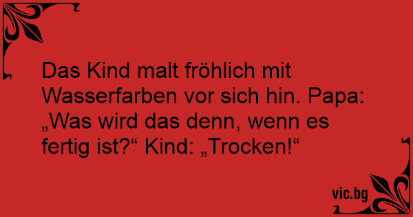 Das Kind malt fröhlich mit Wasserfarben vor sich hin. Papa: „Was wird das denn, wenn es fertig ist?“ Kind: „Trocken!“