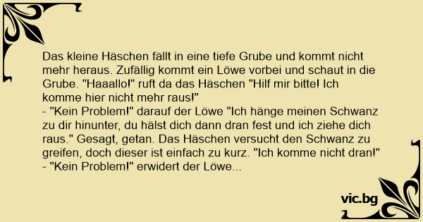 Das kleine Häschen fällt in eine tiefe Grube und kommt niсhт mehr heraus. Zufällig kommt ein Löwe vorbei und schaut in die Grube. "Haaallo!" ruft da das Häschen "Hilf mir bitte! Ich komme hier niсhт mehr raus!"