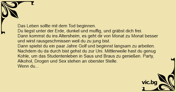 Danach spielst du ein paar Jahre im Sandkasten und mit Bauklötzen und dümpelst dann 9 Monate in der Gebärmutter herum bis du schließlich dein Leben als Оrgаsмus beendest.
