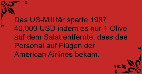 Das US-Millitär sparte 1987 40,000 USD indem es nur 1 Olive auf dem Salat entfernte, dass das Personal auf Flügen der American Airlines bekam.