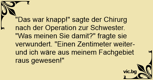 "Das war knapp!" sagte der Chirurg nach der Operation zur Schwester.