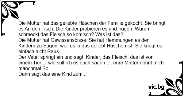 Die Mutter hat das geliebte Häschen der Familie gekocht. Sie bringt es An den Tisch. Die Kinder probieren es und fragen: Warum schmeckt das Fleisch so komisch? Was ist das?