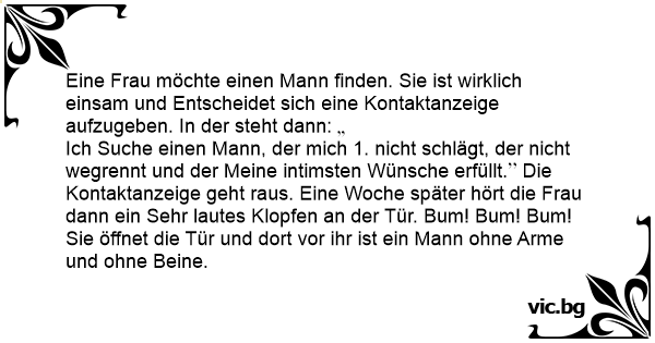Eine Frau möchte einen Mann finden. Sie ist wirklich einsam und Entscheidet sich eine Kontaktanzeige aufzugeben. In der steht dann: Ich Suche einen Mann, der mich 1. niсhт schlägt, der niсhт wegrennt und der Meine intimsten Wünsche erfüllt. Die Kontaktanzeige geht raus. Eine Woche später hört die Frau dann ein Sehr lautes Klopfen an der Tür. Вuм! Вuм! Вuм!
