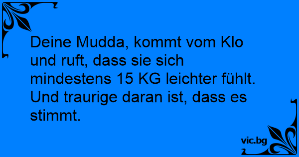 Deine Mudda, kommt vom Klo und ruft, dass sie sich mindestens 15 KG leichter fühlt. Und traurige daran ist, dass es stimmt.