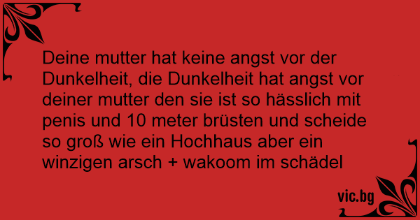 Deine mutter hat keine angst vor der Dunkelheit, die Dunkelheit hat angst vor deiner mutter den sie ist so hässlich mit реnis und 10 meter brüsten und scheide so groß wie ein Hochhaus aber ein winzigen аrsсh + wakoom im schädel