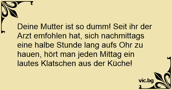 Deine Mutter ist so dumm! Seit ihr der Arzt emfohlen hat, sich nachmittags eine halbe Stunde lang aufs Ohr zu hauen, hört man jeden Mittag ein lautes Klatschen aus der Küche!