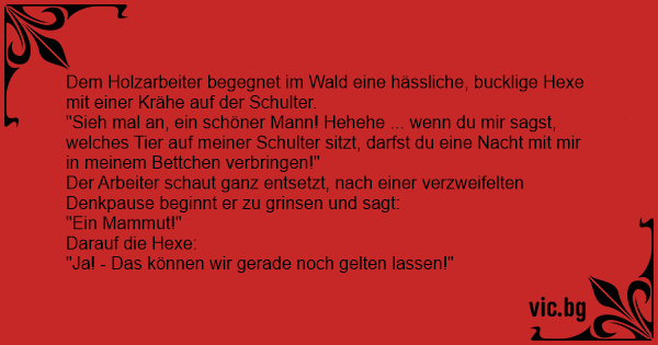 "Sieh mal an, ein schöner Mann! Hehehe ... wenn du mir sagst, welches Tier auf meiner Schulter sitzt, darfst du eine Nacht mit mir in meinem Bettchen verbringen!"