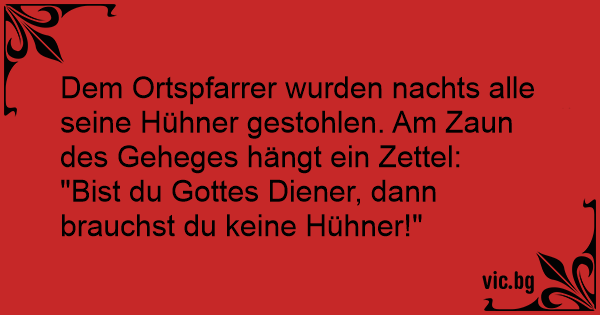 Dem Ortspfarrer wurden nachts alle seine Hühner gestohlen. Am Zaun des Geheges hängt ein Zettel: