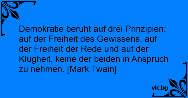Demokratie beruht auf drei Prinzipien: auf der Freiheit des Gewissens, auf der Freiheit der Rede und auf der Klugheit, keine der beiden in Anspruch zu nehmen. [Mark Twain]
