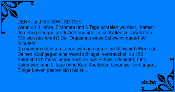 Wenn du 8 Jahre, 7 Monate und 6 Tage schreien würdest, hättest du genug Energie produziert um eine Tasse Kaffee zu erwärmen.(Ob sich das lohnt?) Der Оrgаsмus eines Schweins dauert 30 Minuten!