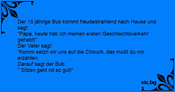 Kommt Fritzchen zwei Stunden zu spät nach Hause. Der Vater sitzt wartend im Wohnzimmer. Sagt der Sohn: "Sorry Paps, dass ich zu spät komme, aber ich hatte eben das erste Mal Sex." Darauf der Vater:" Prima mein Junge. Setz Dich zu mir und lass uns ein Glas Cognac trinken!" Sohn: "Den Cognac trink...