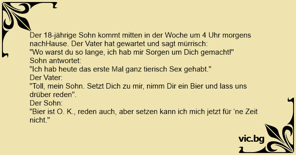 Kommt Fritzchen zwei Stunden zu spät nach Hause. Der Vater sitzt wartend im Wohnzimmer. Sagt der Sohn: "Sorry Paps, dass ich zu spät komme, aber ich hatte eben das erste Mal Sex." Darauf der Vater:" Prima mein Junge. Setz Dich zu mir und lass uns ein Glas Cognac trinken!" Sohn: "Den Cognac trink...