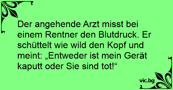 Der angehende Arzt misst bei einem Rentner den Blutdruck. Er schüttelt wie wild den Kopf und meint: „Entweder ist mein Gerät kaputt oder Sie sind tot!“