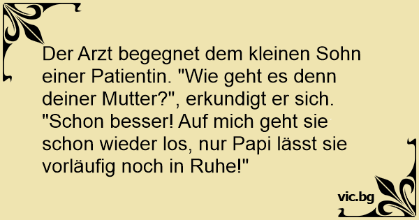 Der Arzt begegnet dem kleinen Sohn einer Patientin. "Wie geht es denn deiner Mutter?", erkundigt er sich.