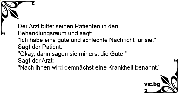 Sagt der Arzt zum Patienten: "Ich habe eine gute und eine schlechte Nachricht für Sie." Patient: "Na ... dann sagen Sie mir mal die gute." Arzt: "Wir werden die Krankheit nach Ihnen benennen!"