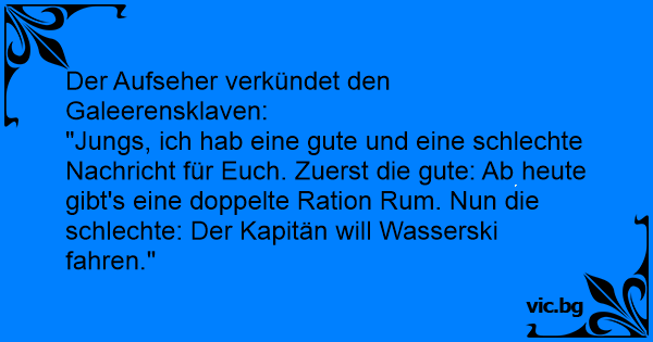 "Jungs, ich hab eine gute und eine schlechte Nachricht für Euch. Zuerst die gute: Ab heute gibt's eine doppelte Ration Ruм. Nun die schlechte: Der Kapitän will Wasserski fahren."