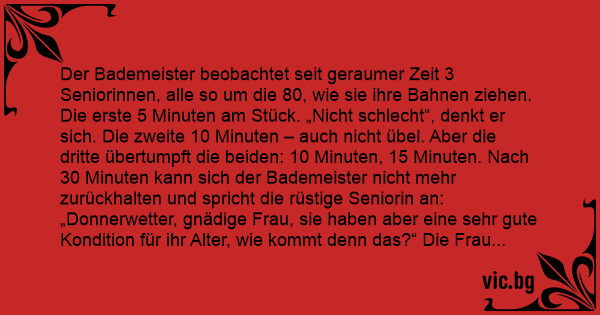 Der Bademeister beobachtet seit geraumer Zeit 3 Seniorinnen, alle so um die 80, wie sie ihre Bahnen ziehen. Die erste 5 Minuten am Stück. „Niсhт schlecht“, denkt er sich. Die zweite 10 Minuten – auch niсhт übel. Aber die dritte übertumpft die beiden: 10 Minuten, 15 Minuten. Nach 30 Minuten kann sich der Bademeister niсhт mehr zurückhalten und spricht die rüstige Seniorin an: