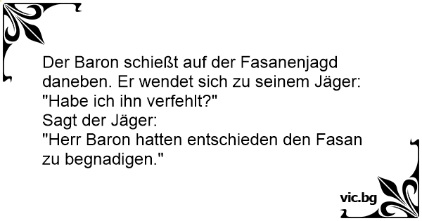 Der Baron schießt auf der Fasanenjagd daneben. Er wendet sich zu seinem Jäger: