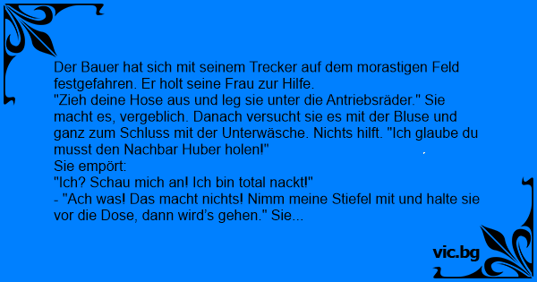"Zieh deine Hose aus und leg sie unter die Antriebsräder." Sie macht es, vergeblich. Danach versucht sie es mit der Bluse und ganz zum Schluss mit der Unterwäsche. Nichts hilft. "Ich glaube du musst den Nachbar Huber holen!"