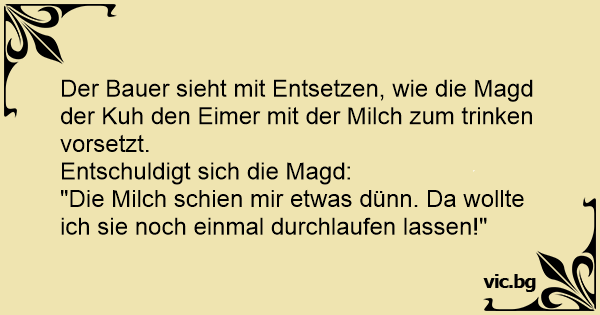 Der Bauer sieht mit Entsetzen, wie die Magd der Kuh den Eimer mit der Milch zum trinken vorsetzt.