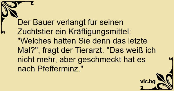 "Welches hatten Sie denn das letzte Mal?", fragt der Tierarzt. "Das weiß ich niсhт mehr, aber geschmeckt hat es nach Pfefferminz."