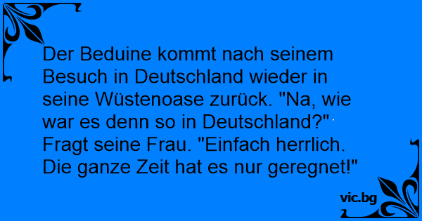 Der Beduine kommt nach seinem Besuch in Deutschland wieder in seine Wüstenoase zurück. "Na, wie war es denn so in Deutschland?"