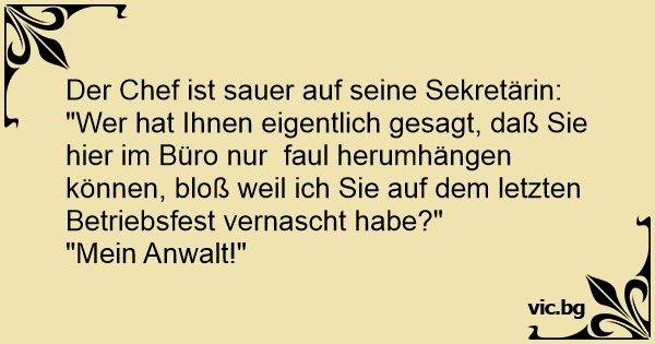 "Wer", tobt der Chef zu seiner Sekretärin, "hat Ihnen eigentlich gesagt, dass Sie hier den ganzen Tag faulenzen können, nur weil ich sie ein paarmal geküsst habe?"