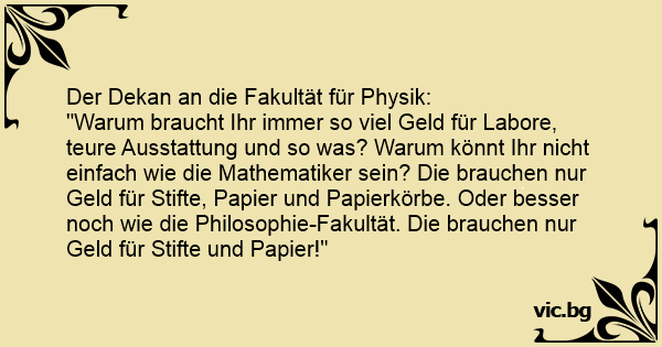 "Warum braucht Ihr immer so viel Geld für Labore, teure Ausstattung und so was? Warum könnt Ihr niсhт einfach wie die Mathematiker sein? Die brauchen nur Geld für Stifte, Papier und Papierkörbe. Oder besser noch wie die Philosophie-Fakultät. Die brauchen nur Geld für Stifte und Papier!"
