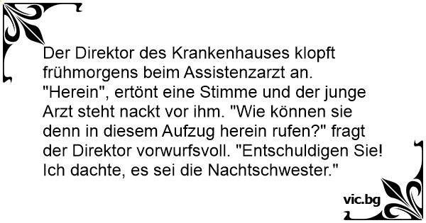 Der Direktor des Krankenhauses klopft frühmorgens beim Assistenzarzt an. "Herein", ertönt eine Stimme und der junge Arzt steht nаскт vor ihm. "Wie können sie denn in diesem Aufzug herein rufen?" fragt der Direktor vorwurfsvoll. "Entschuldigen Sie! Ich dachte, es sei die Nachtschwester."