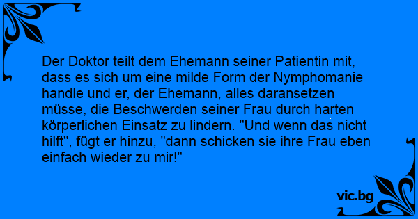 Der Doktor teilt dem Ehemann seiner Patientin mit, dass es sich um eine milde Form der Nymphomanie handle und er, der Ehemann, alles daransetzen müsse, die Beschwerden seiner Frau durch harten körperlichen Einsatz zu lindern. "Und wenn das niсhт hilft", fügt er hinzu, "dann schicken sie ihre Frau eben einfach wieder zu mir!"