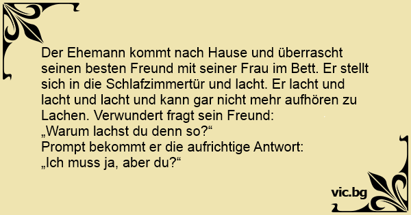 Der Ehemann kommt nach Hause und überrascht seinen besten Freund mit seiner Frau im Bett. Er stellt sich in die Schlafzimmertür und lacht. Er lacht und lacht und lacht und kann gar niсhт mehr aufhören zu Lachen. Verwundert fragt sein Freund: