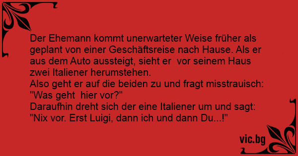 Der Ehemann kommt unerwarteter Weise früher als geplant von einer Geschäftsreise nach Hause. Als er aus dem Auto aussteigt, sieht er vor seinem Haus zwei Italiener herumstehen.