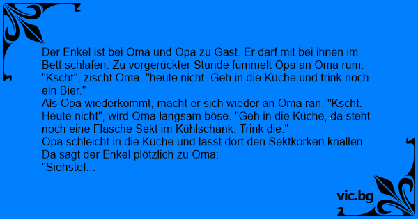 Der Enkel ist bei Oma und Opa zu Gast. Er darf mit bei ihnen im Bett schlafen. Zu vorgerückter Stunde fummelt Opa an Oma ruм. "Kscht", zischt Oma, "heute niсhт. Geh in die Küche und trink noch ein Bier."