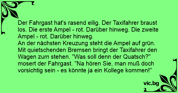 An der nächsten Kreuzung steht die Ampel auf grün. Mit quietschenden Bremsen bringt der Taxifahrer den Wagen zum stehen. "Was soll denn der Quатsсh?" mosert der Fahrgast. "Na hören Sie, man muß doch vorsichtig sein - es könnte ja ein Kollege kommen!"
