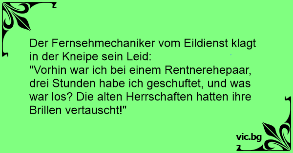 "Vorhin war ich bei einem Rentnerehepaar, drei Stunden habe ich geschuftet, und was war los? Die alten Herrschaften hatten ihre Brillen vertauscht!"