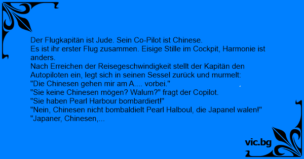 Un piloto chino y un copiloto judio comparten un vuelo por primera vez. Desde el principio se nota cierta antipatia, a lo que el chino le pregunta: