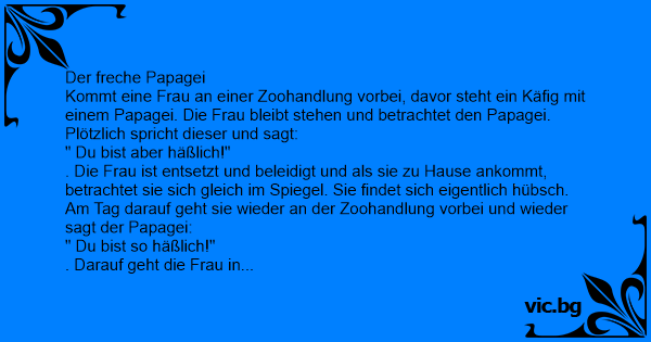 . Die Frau ist entsetzt und beleidigt und als sie zu Hause ankommt, betrachtet sie sich gleich im Spiegel. Sie findet sich eigentlich hübsch. Am Tag darauf geht sie wieder an der Zoohandlung vorbei und wieder sagt der Papagei: