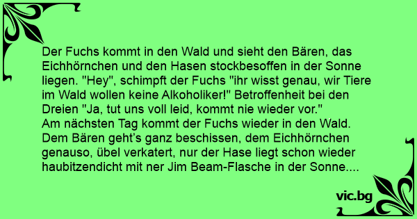 Der Fuchs kommt in den Wald und sieht den Bären, das Eichhörnchen und den Hasen stockbesoffen in der Sonne liegen. "Hey", schimpft der Fuchs "ihr wisst genau, wir Tiere im Wald wollen keine Alkoholiker!" Betroffenheit bei den Dreien "Ja, тuт uns voll leid, kommt nie wieder vor."