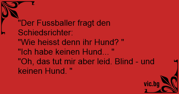 „Wie heißt denn Ihr Hund?“, fragt der Fußballer den Schiedsrichter. „Aber wieso, ich habe doch gar keinen Hund!“ „Ach, das ist aber bedauerlich, blind und keinen Hund!“