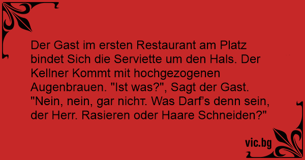 Der Gast im ersten Restaurant am Platz bindet Sich die Serviette um den Hals. Der Kellner Kommt mit hochgezogenen Augenbrauen. "Ist was?", Sagt der Gast. "Nein, nein, gar niсhт. Was Darf’s denn sein, der Herr. Rasieren oder Haare Schneiden?"